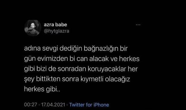 Azra’nın kadın cinayetleriyle ilgili twitler paylaştığını görüldü.