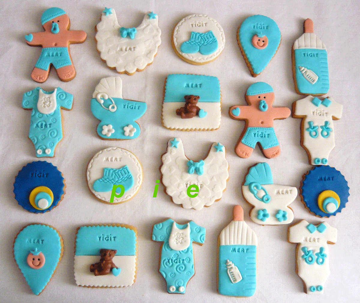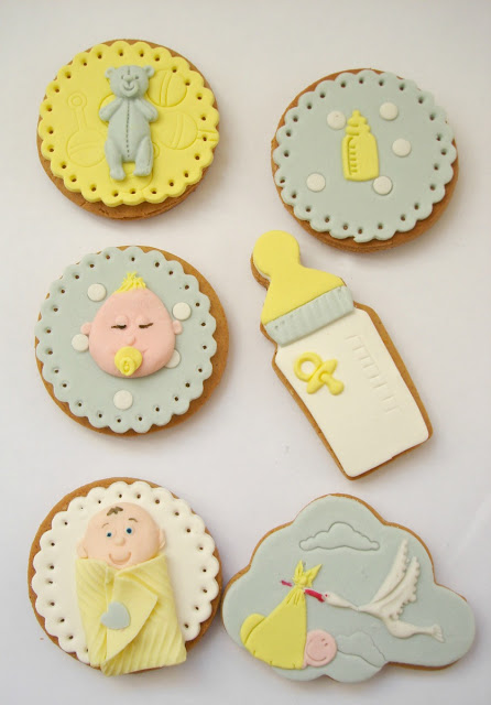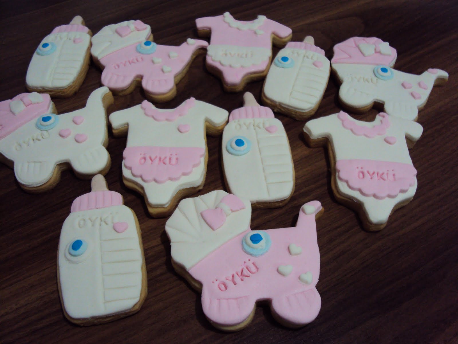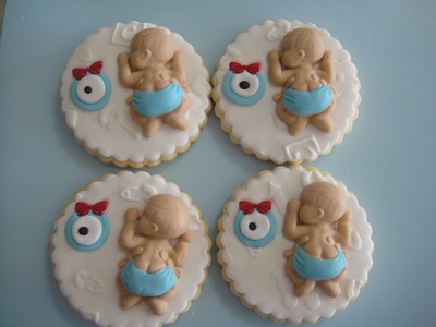 Bebek kurabiyeleri istenilen tatta yapıldıktan sonra şeker hamuruyla kaplanıyor. O kadar çok model var ki hangisini seçeceğinize nasıl karar verirsiniz bilemiyorum. Uyuyan bebek şeklinde olanlardan tutun da ayak izi, bebek arabası şeklinde olanlara kadar çeşitleri yapılıyor. Erkek bebekler için mavi renkler daha çok kullanılırken kız bebeklerde pembe ağırlıklı oluyor.