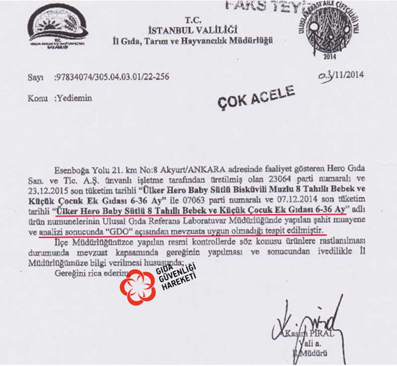 İstanbul İl Gıda Tarım ve Hayvancılık Müdürlüğü çalışanlarının piyasa denetimleri sırasında aldıkları 23064 parti nolu “Ülker Hero Baby Sütlü, Bisküvili, Muzlu, 8 Tahıllı Bebek ve Küçük Çocuk Ek Gıdası 6-36 ay” ile 07063 parti nolu “Ülker Hero Baby Sütlü 8 Tahıllı Bebek ve Küçük Çocuk Ek Gıdası 6-36 ay” ürünlerinin incelemesi sırasında GDO tespit edildi. Bu tespiti, Gıda Tarım ve Hayvancılık Bakanlığına ait Ankara Ulusal Referans Laboratuvarı da onayladı.