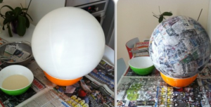Hazırlanan un ve su bir bulamaç niteliğinde hazırlanmalıdır. Hazırladığınız bulamacı şişirilen balonu kaplayacak şekilde uygulayın. Bu doğal bir yapıştırıcı görevi görecektir. Balonun çevresini gazete kağıtlarıyla kaplayın ve kuruması için yaklaşık 1 saat bekletin. Balonda avuç içi kadar bir kısmı açıkta bırakmalısınız. Boş bıraktığınız alan dışındaki kısımları 3-4 kat gazete kağıtları ile kaplayın. Her uygulamada kuruması için bekleyip yeni yapacağınız katı uygulamalısınız. Bu işlemler tamamlandıktan sonra, içindeki balonu bir iğne yardımı ile patlatıp içinden çıkarın.