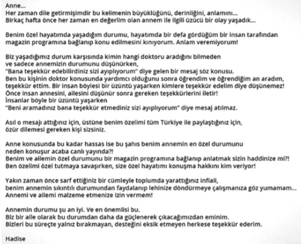 Hadise de basın danışmanı aracılığıyla “İntihar yok, gıda zehirlenmesi” diyerek bu iddiayı yalanlamıştı. Ancak dün acı gerçek ortaya çıktı. Hadise, annesinin intihara teşebbüs ettiği gece doktor tavsiyesi için aranılan modacı Nur Yerlitaş’a canlı yayında söylediklerinden dolayı ateş püskürdü. Konuşulanların aralarında sır olacağını düşünen Hadise, Yerlitaş’ın bu davranışına çok sinirlendi. Instagram hesabından bir yazı yayınladı. Yazı şöyle: