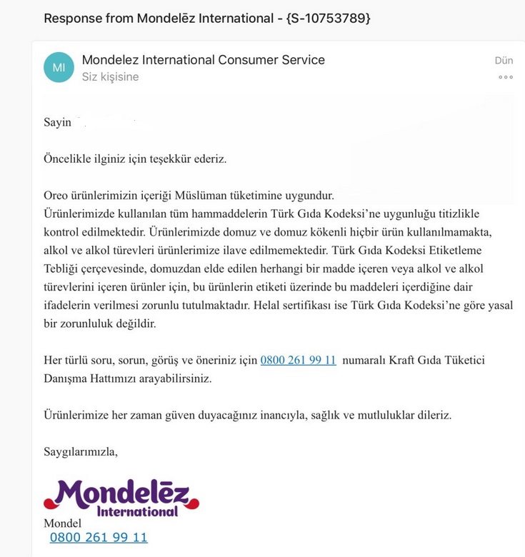 “Oreo ürünlerimizin içeriği Müslüman tüketimine uygundur. Ürünlerimizde kullanılan tüm hammddelerin Türk Gıda Kodeksi’ne uygunluğu titizlikle kontrol edilmektedir.