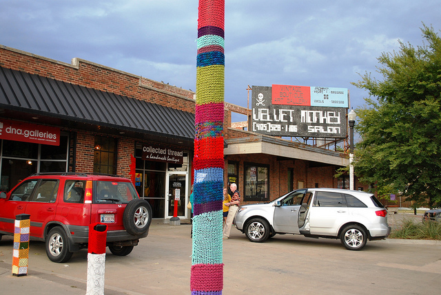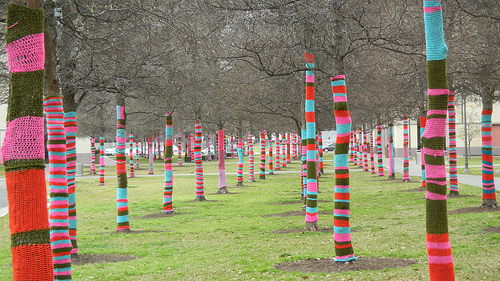 Sokaklardaki ağaçlar, telefon kulubeleri, arabalar ve sınır tellerini bile yün iplerle işlediler. Gerçekten sokaklar çok hoş bir görünüme kavuşmuş. Kadın elinin değdiği her şey güzelleşiyor. Rengarenk iplerle görülesi bir dünya oluşturmuşlar. Her kadının vermek istediği bir mesaj var elbet. Bu akım bizim ülkemizde de başlasa süper olmaz mı?
