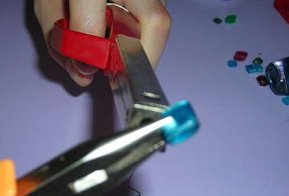 Pet şişeden parçalar kesip oje ile boyayın. Boyalı tarafları iç tarafa gelecek şekilde parçaları rulo şeklinde sarıp pense ile sıkıştırıp çakmakla ısıtın. Ortasından tel geçirip ısıtırsanız delik elde etmiş olursunuz.