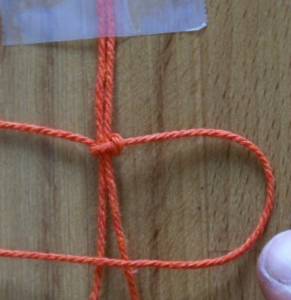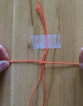 İpin bir tarafı karakterin iki kolunu oluşturacak. Makrome bileklik örer gibi ipleri birbirinin içinden geçirin.