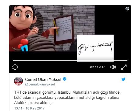 TRT Çocuk kanalında yayınlanan “İstanbul Muhafızları” adlı çizgi filminin daha önceden yayınlanmış bir bölümünde, kötü adam olan Gürgen’in çocuklara yapılacak şeyleri not aldırdığı listenin altına “Gazi Mustafa Kemal” imzası atıldığı öne sürüldü. Tam da 10 Kasım günü, Atatürk’ün anıldığı günde bu konunun gündeme gelmesi akılda soru işaretleri bıraksa da TRT çizgi filmin videosunu YouTube kanalından kaldırdı.